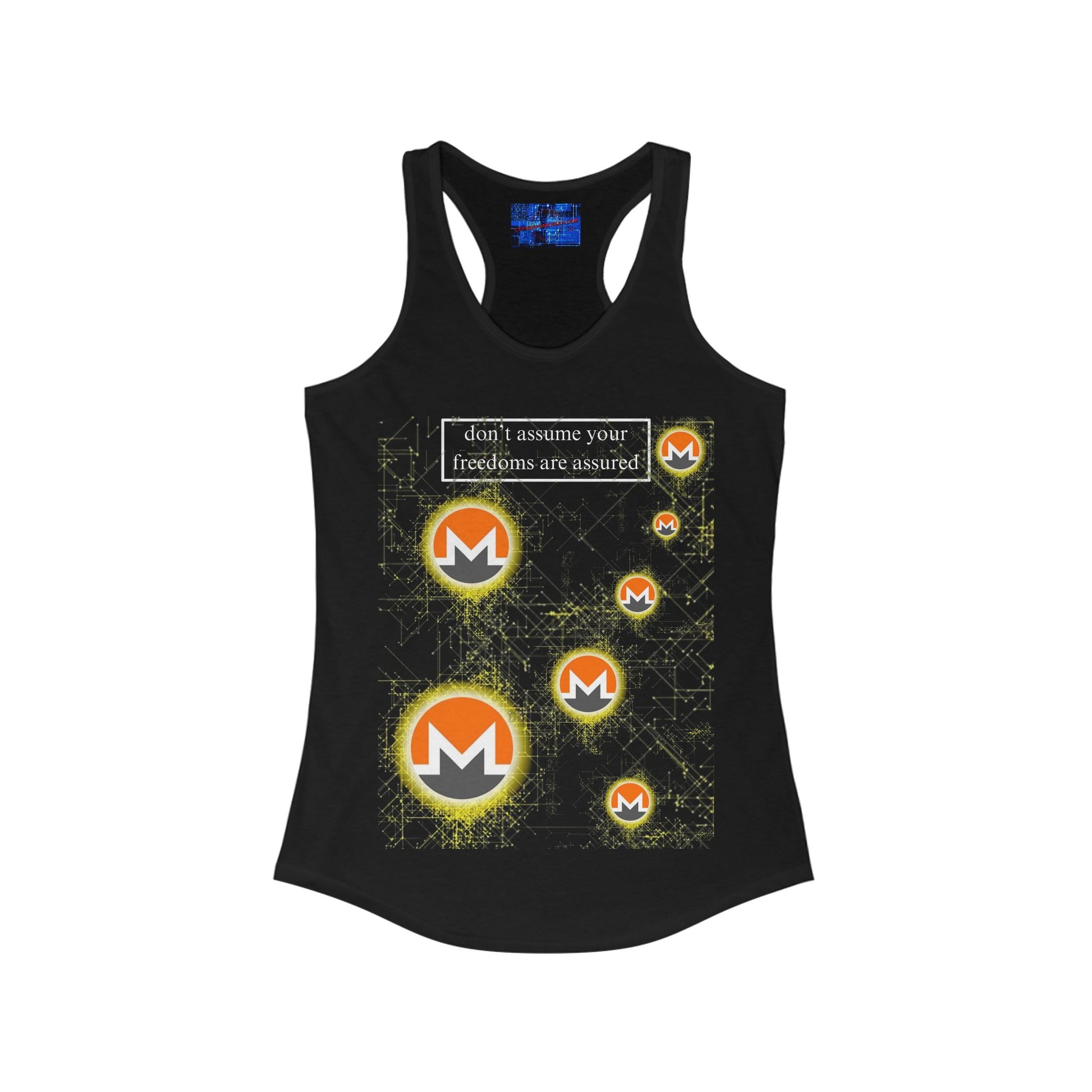 Monero (XMR) don't assume your freedoms are assured Dark colors Women's Racerback Tank Top by cypherpunkgear.com