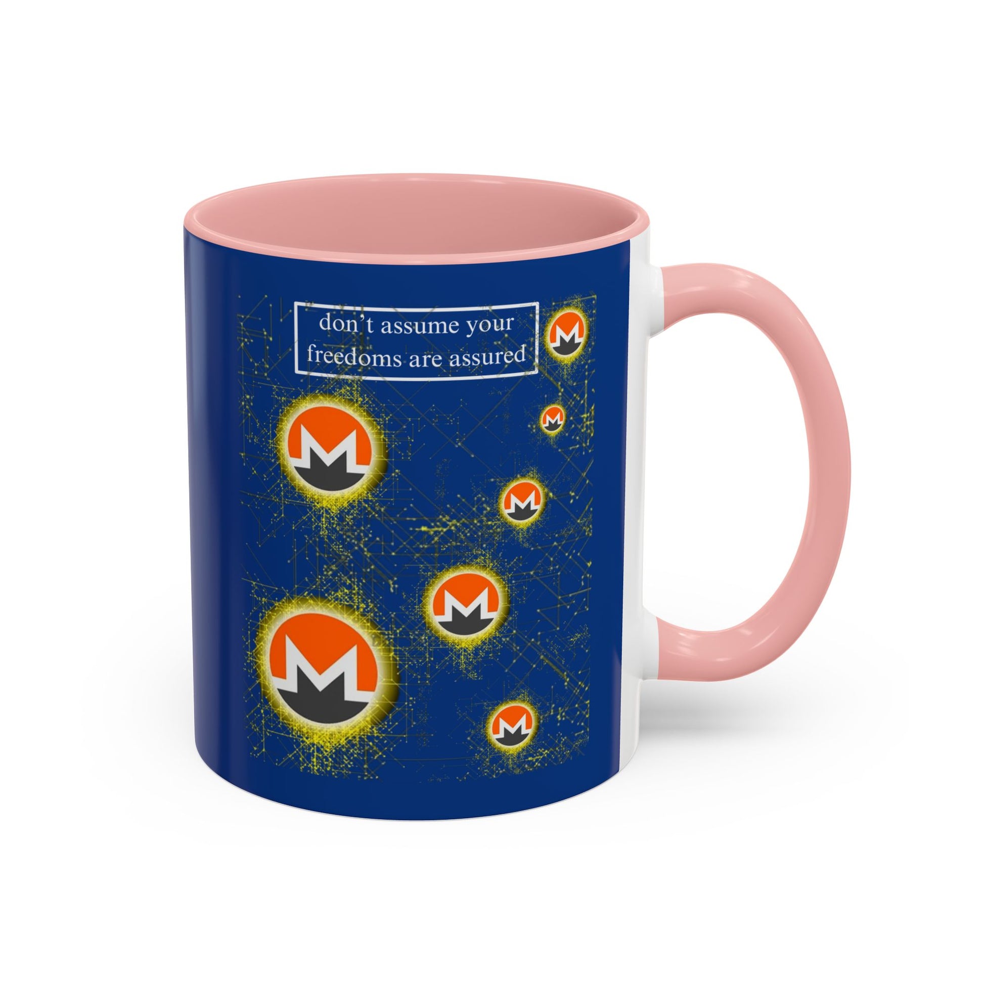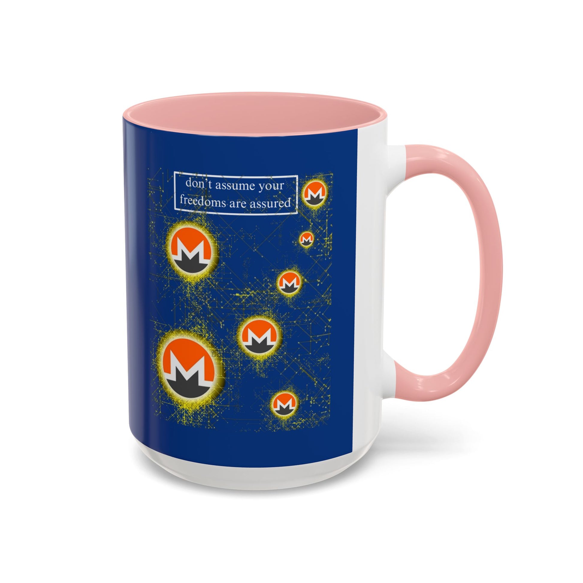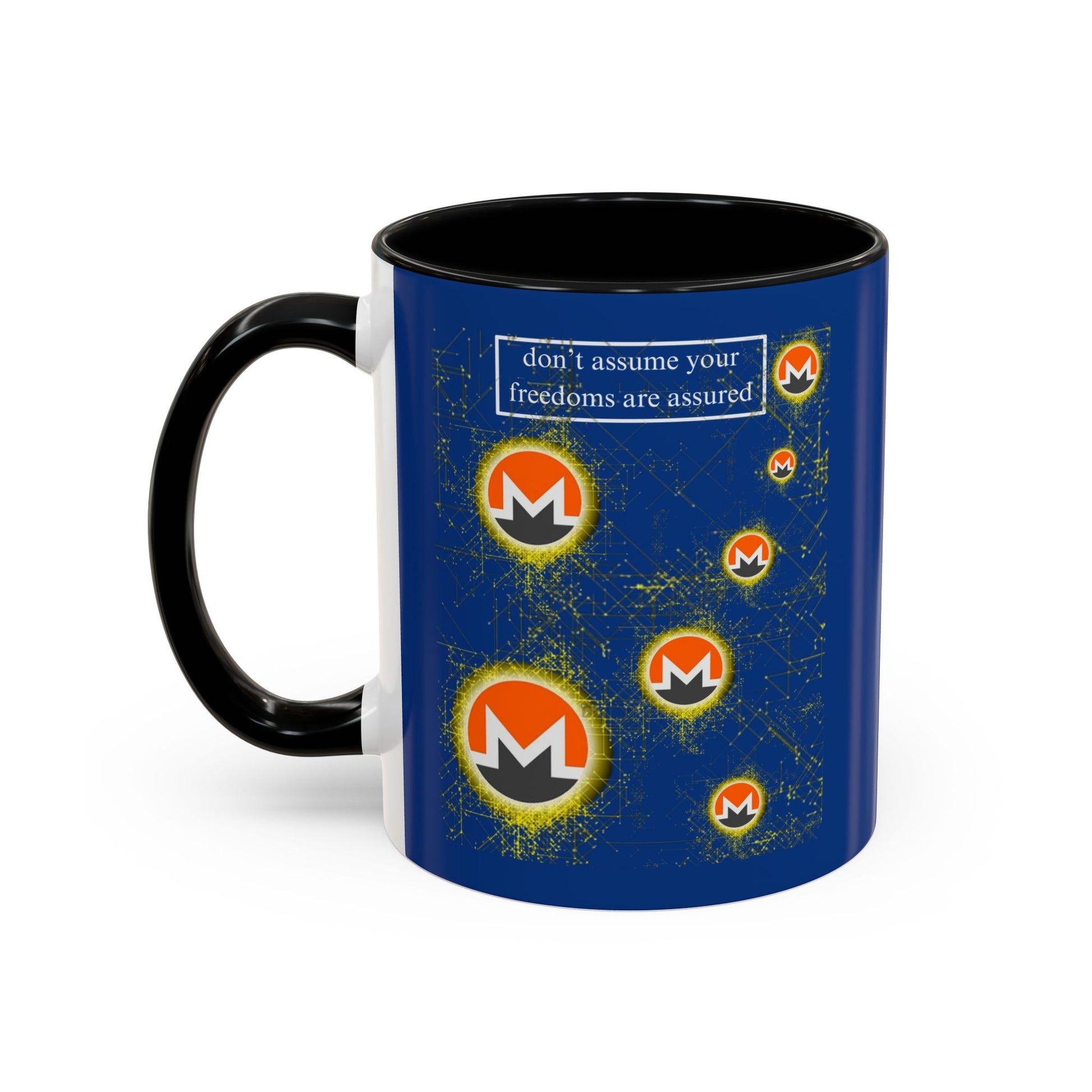 Monero (XMR) don't assume your freedoms are assured Blue Accent Mug by cypherpunkgear.com