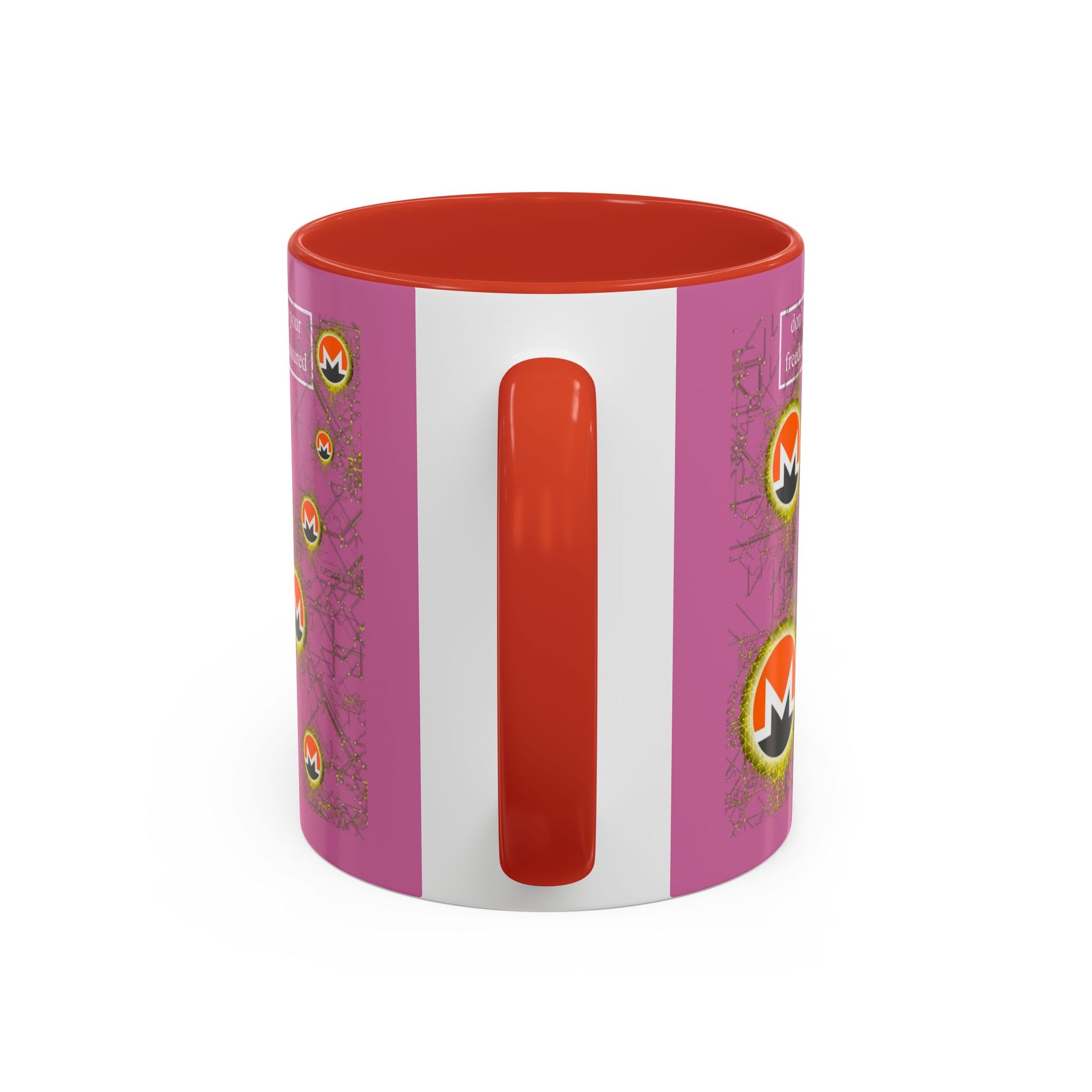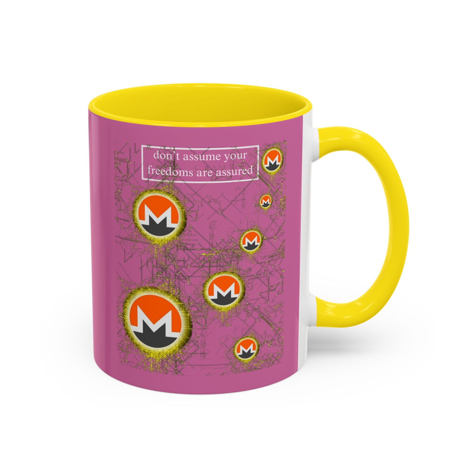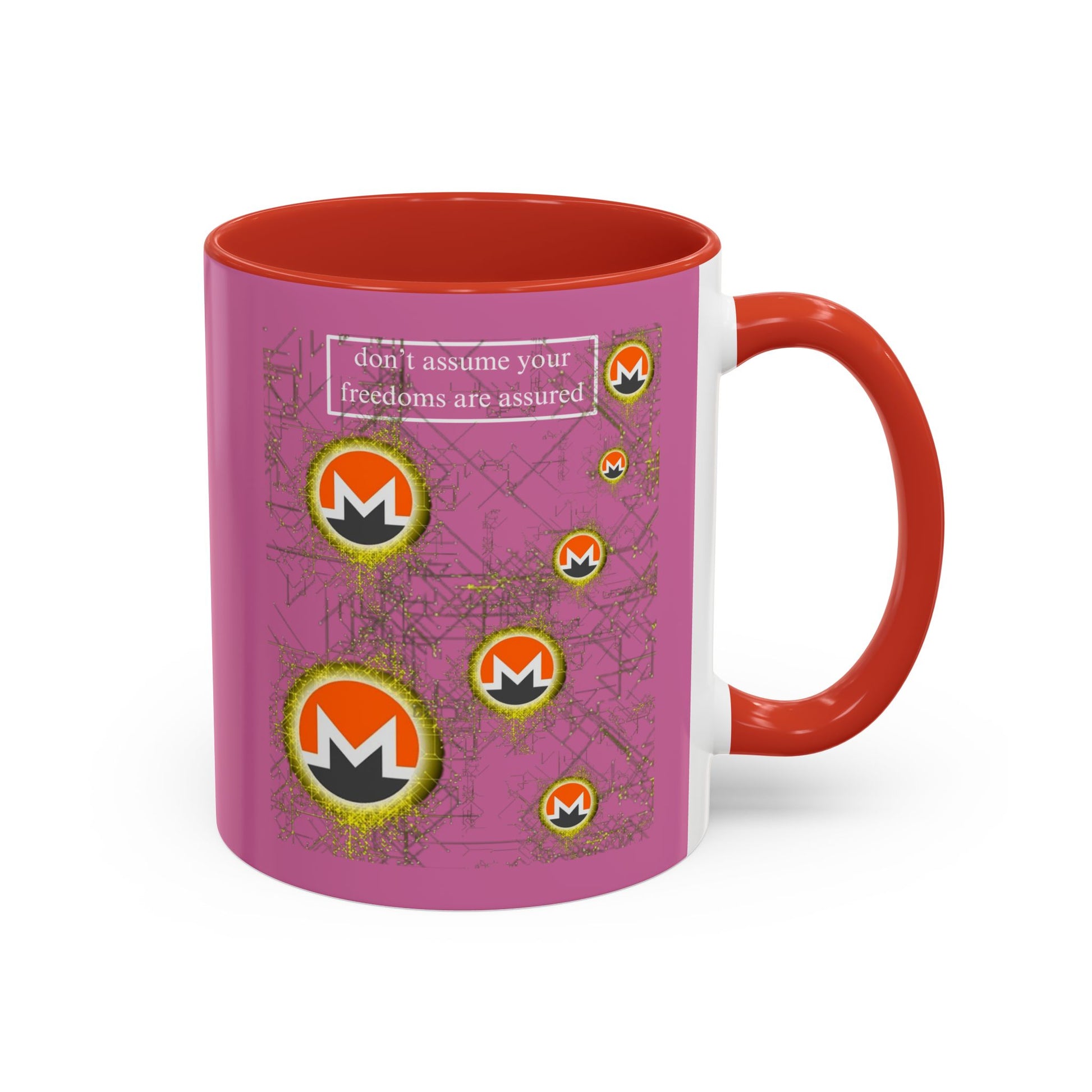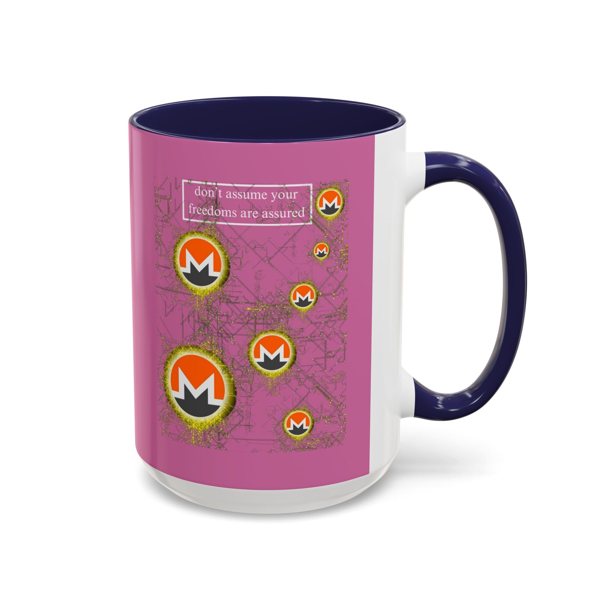 Monero (XMR) don't assume your freedoms are assured Pink Accent Mug by cypherpunkgear.com
