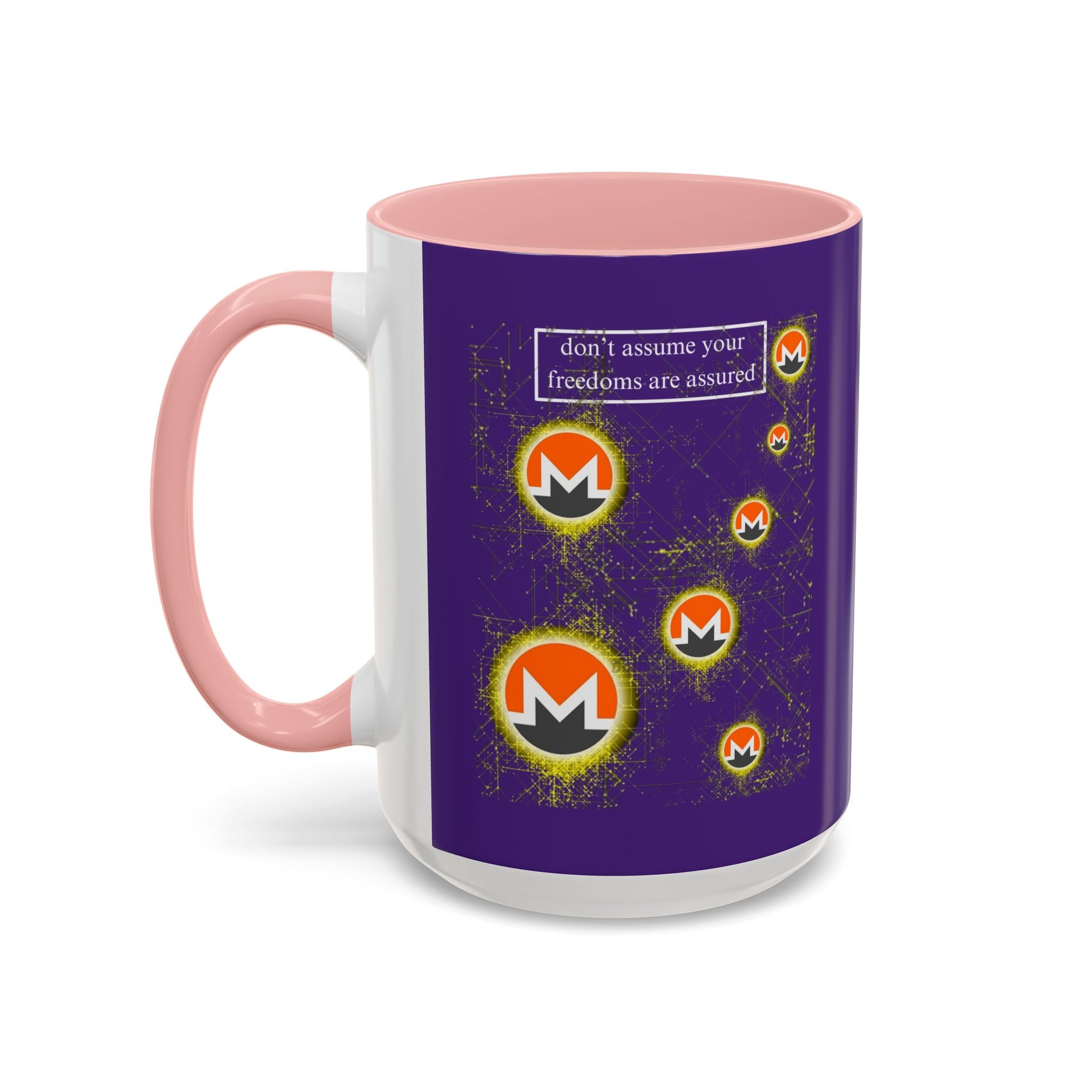 Also available: Monero (XMR) don't assume your freedoms are assured Pink Accent Mug by cypherpunkgear.com