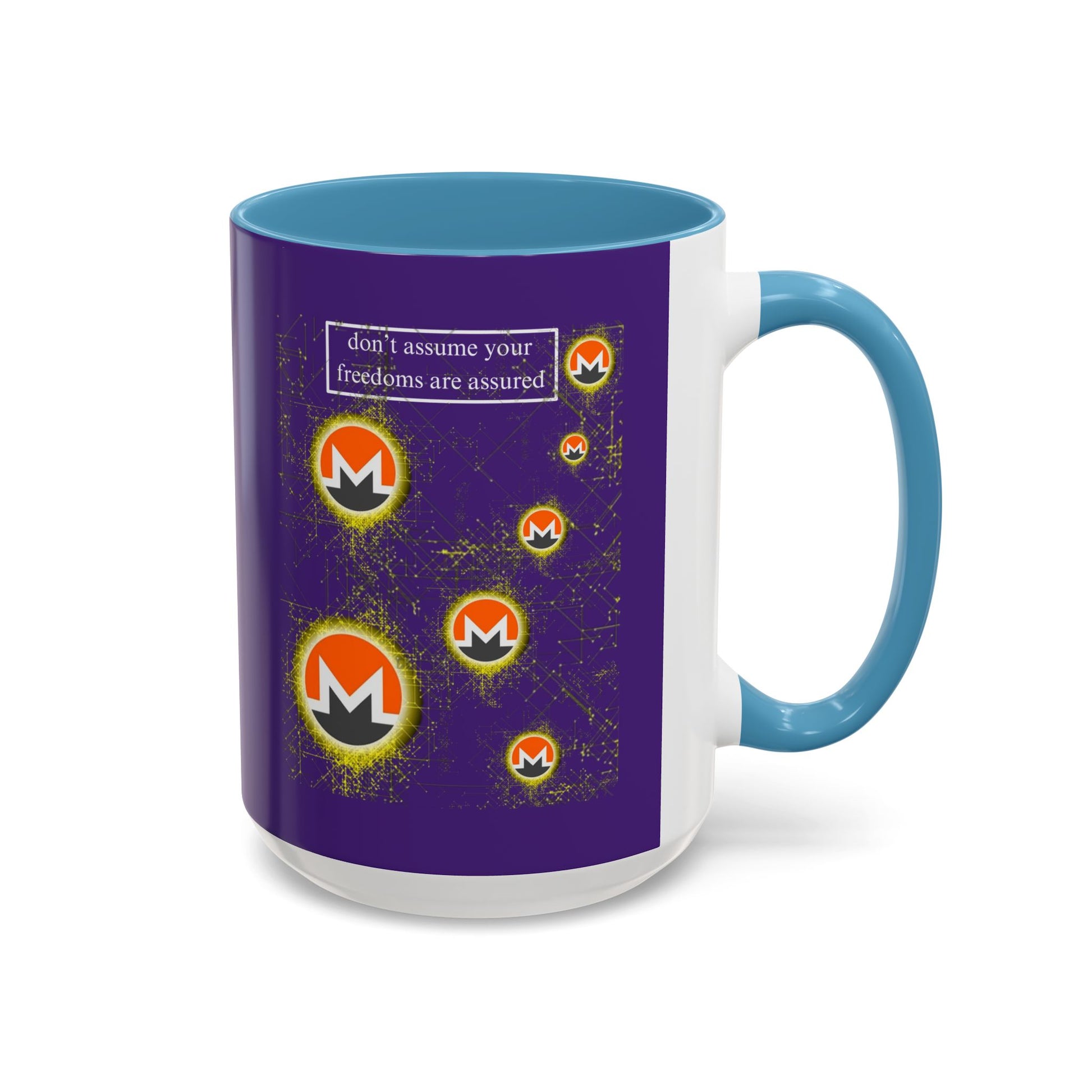 Monero (XMR) don't assume your freedoms are assured Purple Accent Mug by cypherpunkgear.com