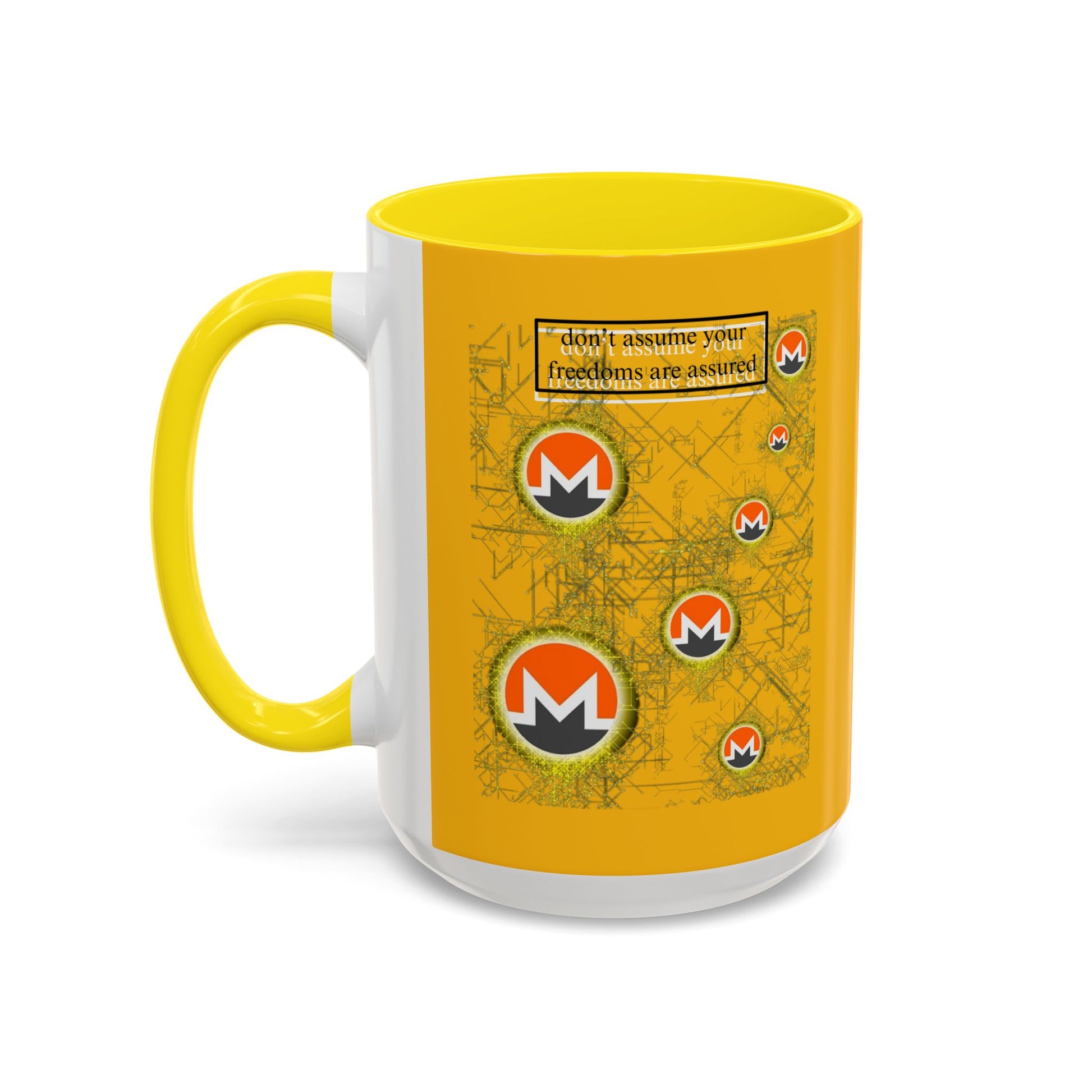 Monero (XMR) don't assume your freedoms are assured Yellow Accent Mug by cypherpunkgear.com