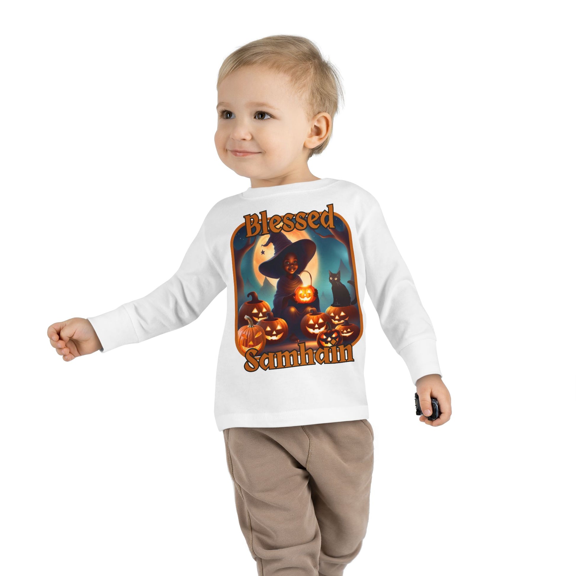 Blessed Samhain Cute Witch Orange font Toddler Long Sleeve Tee by CreepyCrafts.boo