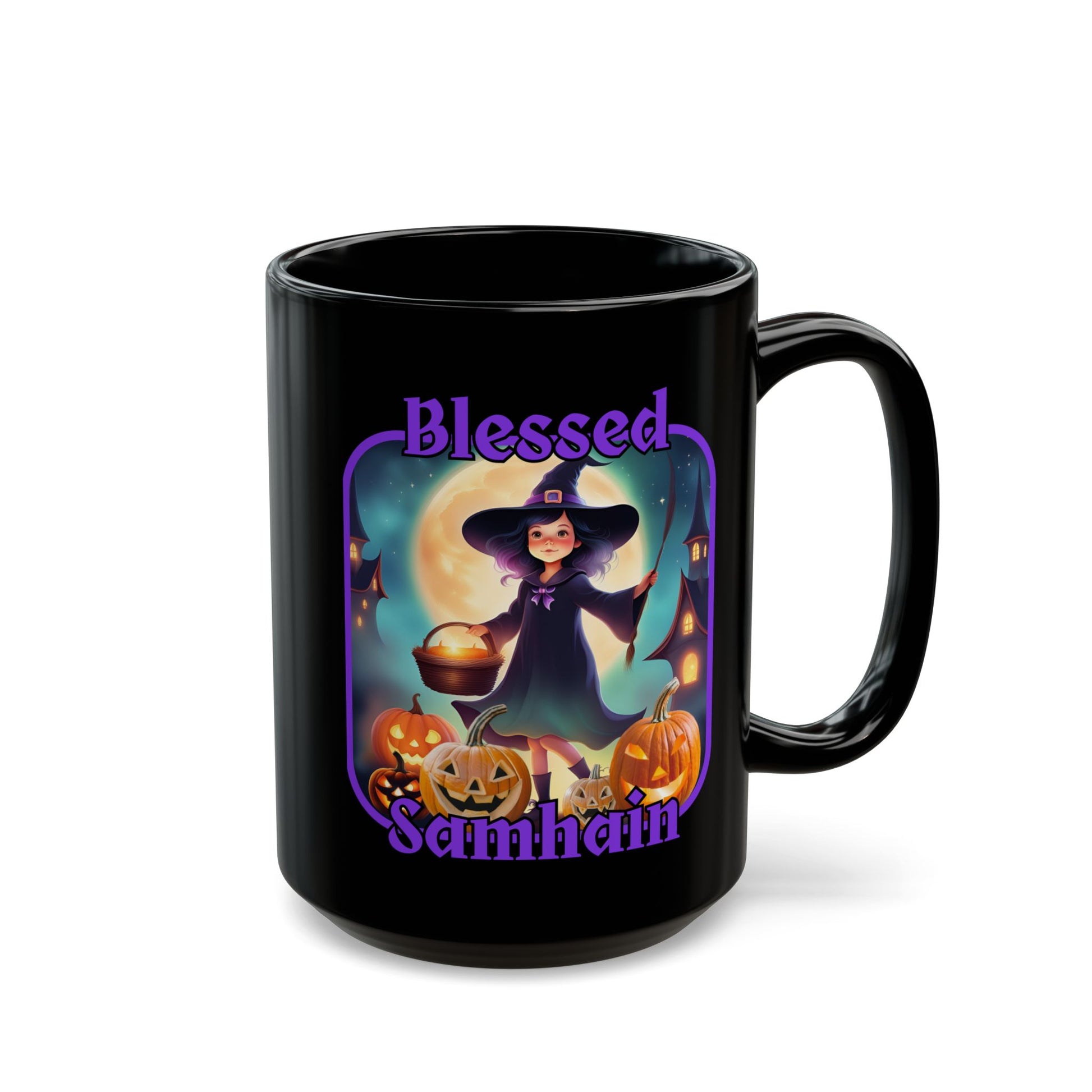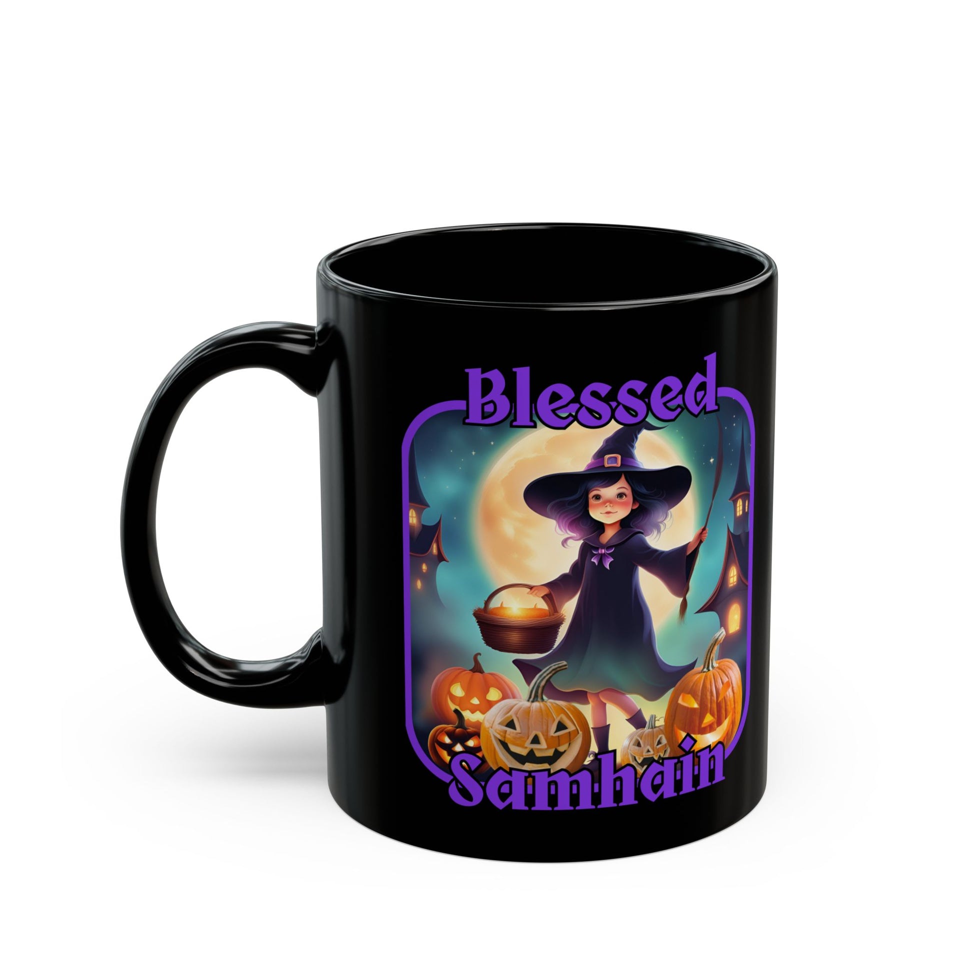 Blessed Samhain Little Witch Purple font Black Mug by CreepyCrafts.boo