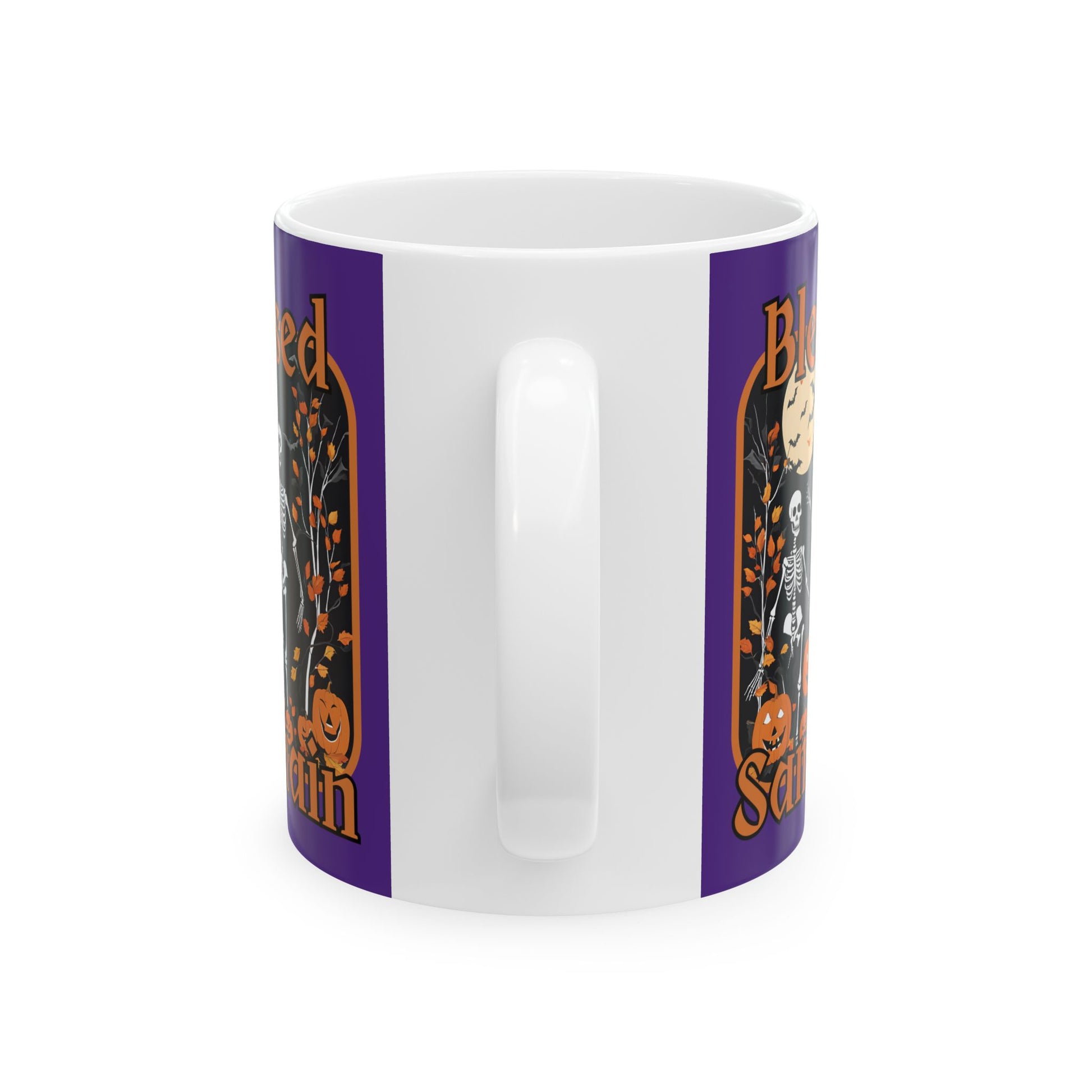 Celebrate the magic of the season with our exclusive Samhain mug featuring eerie skeletons set against a backdrop of glowing jack-o'-lanterns and bats dancing under the enchanting full moon. Perfect for adding a touch of spooky charm, whether you're sipping your morning coffee or reveling in Samhain festivities. Don't miss out on this hauntingly stylish design—order yours today and summon the spirit of the night!