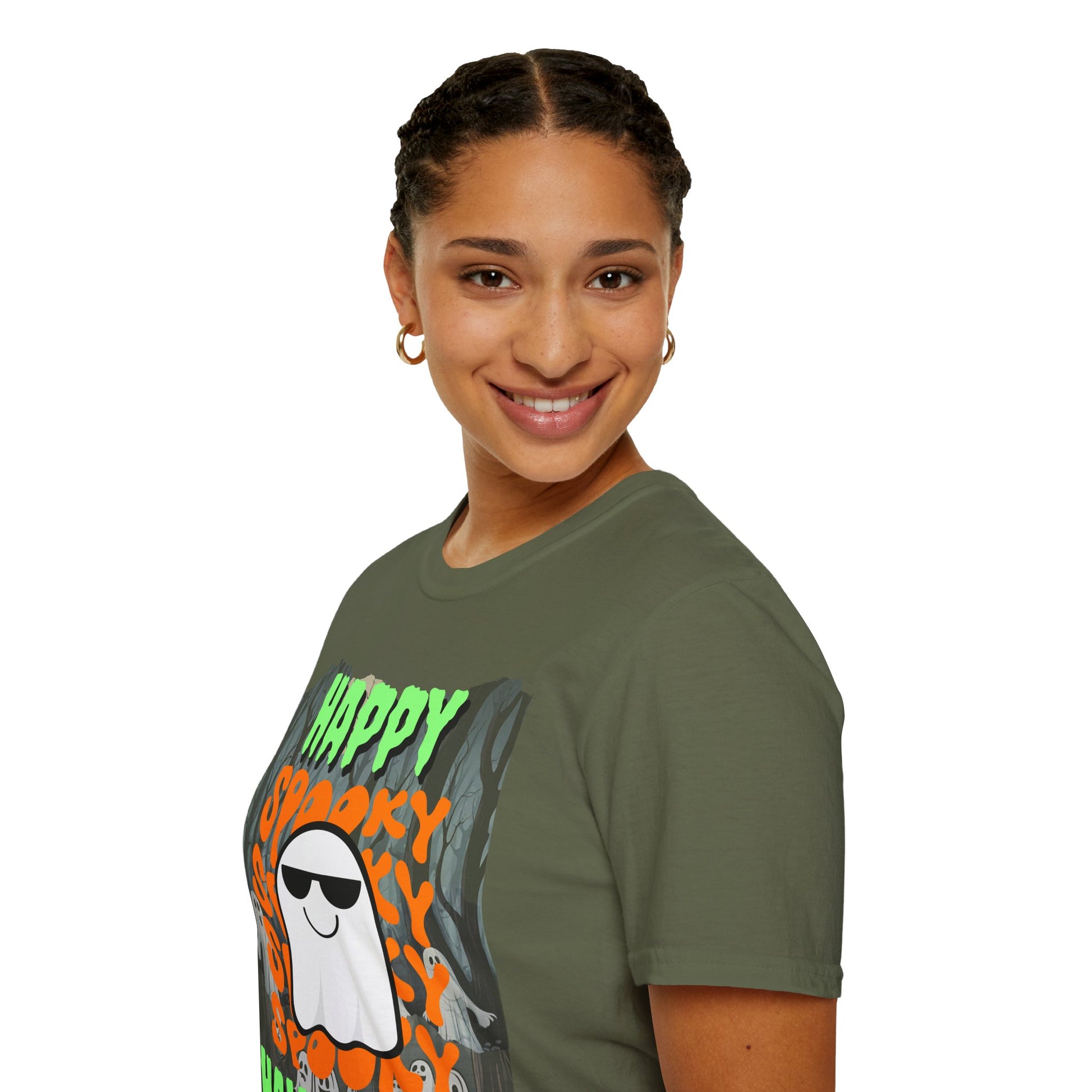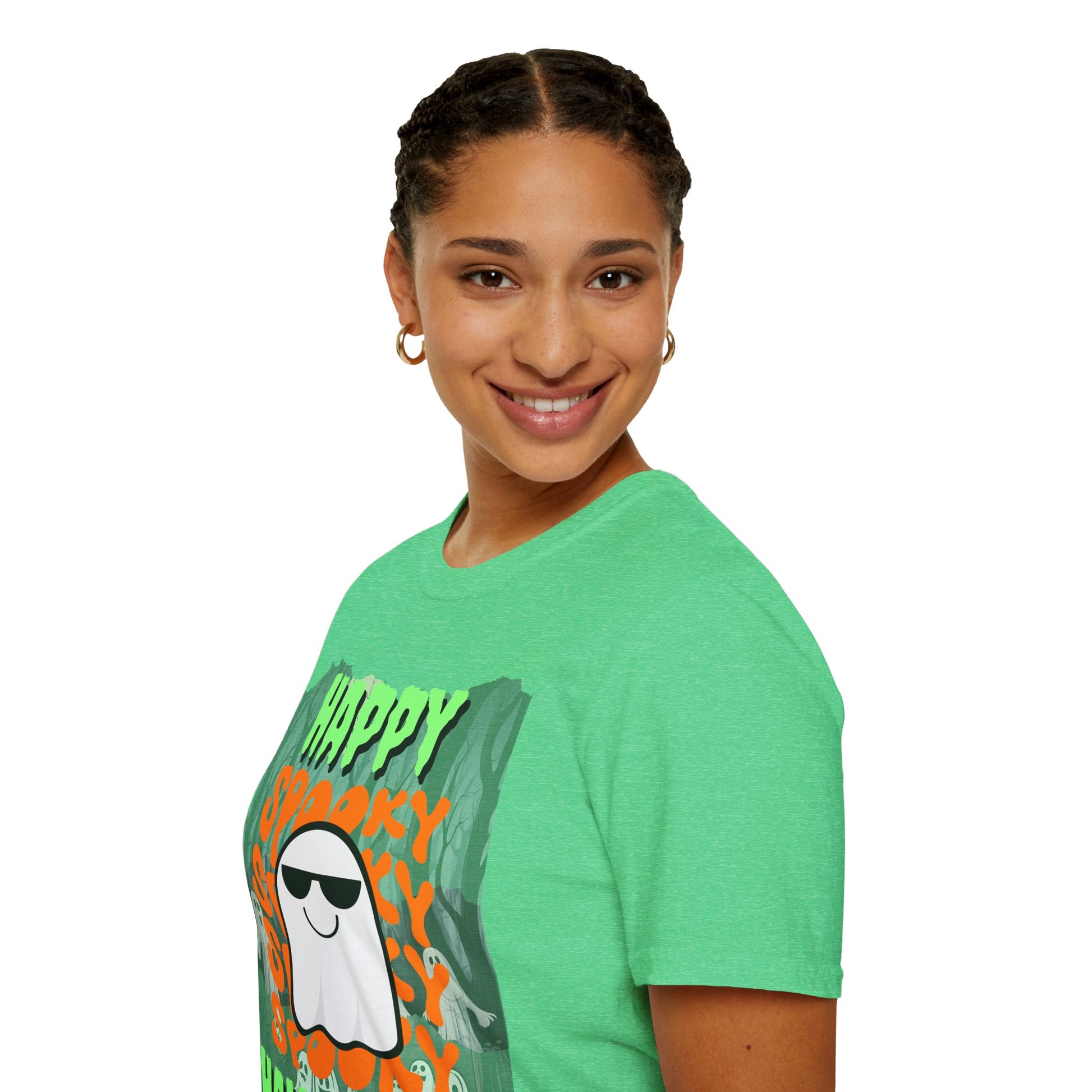 Or in lighter colors: Spooky Happy Halloween Ghost Light colors Green font Unisex T-Shirt by CreepyCrafts.boo