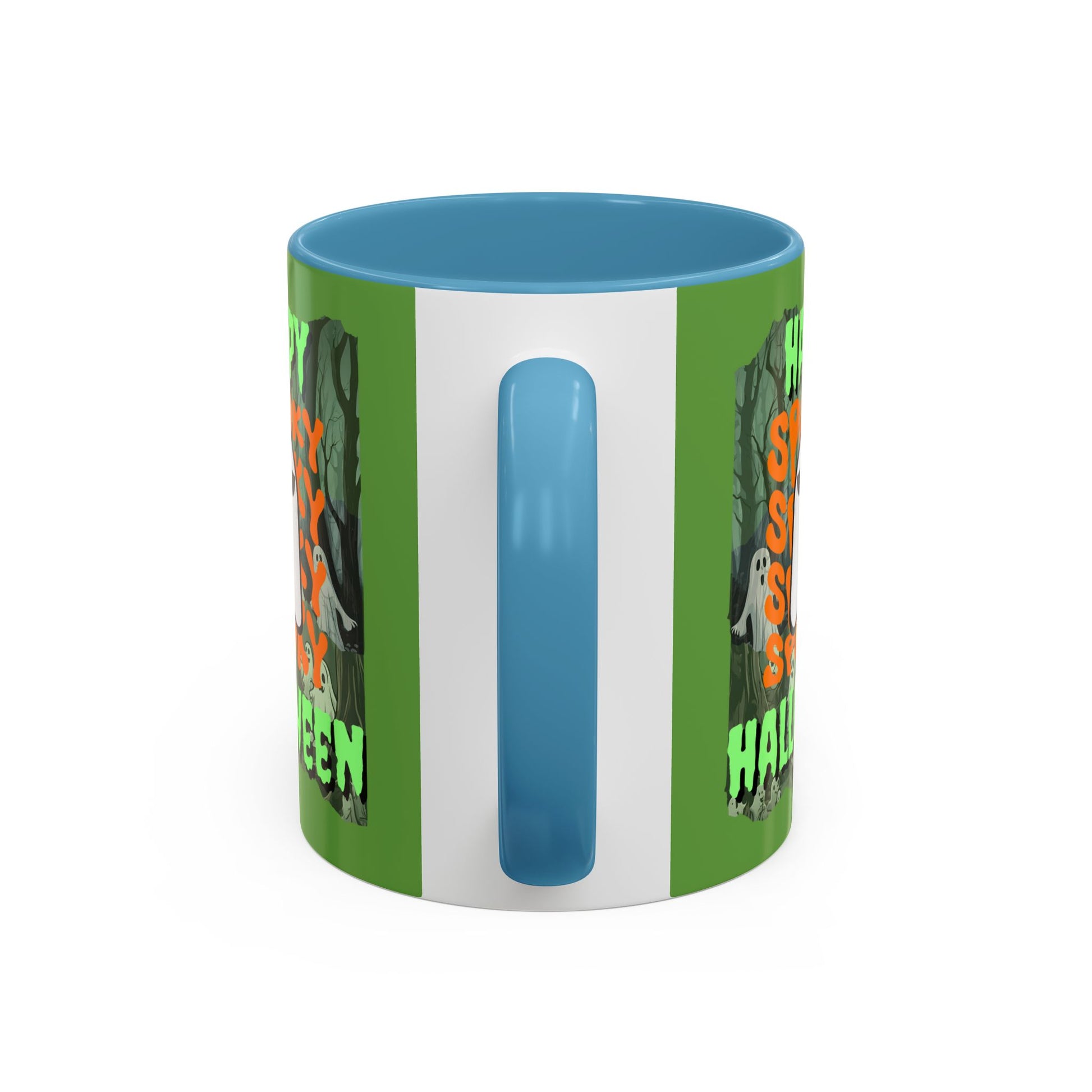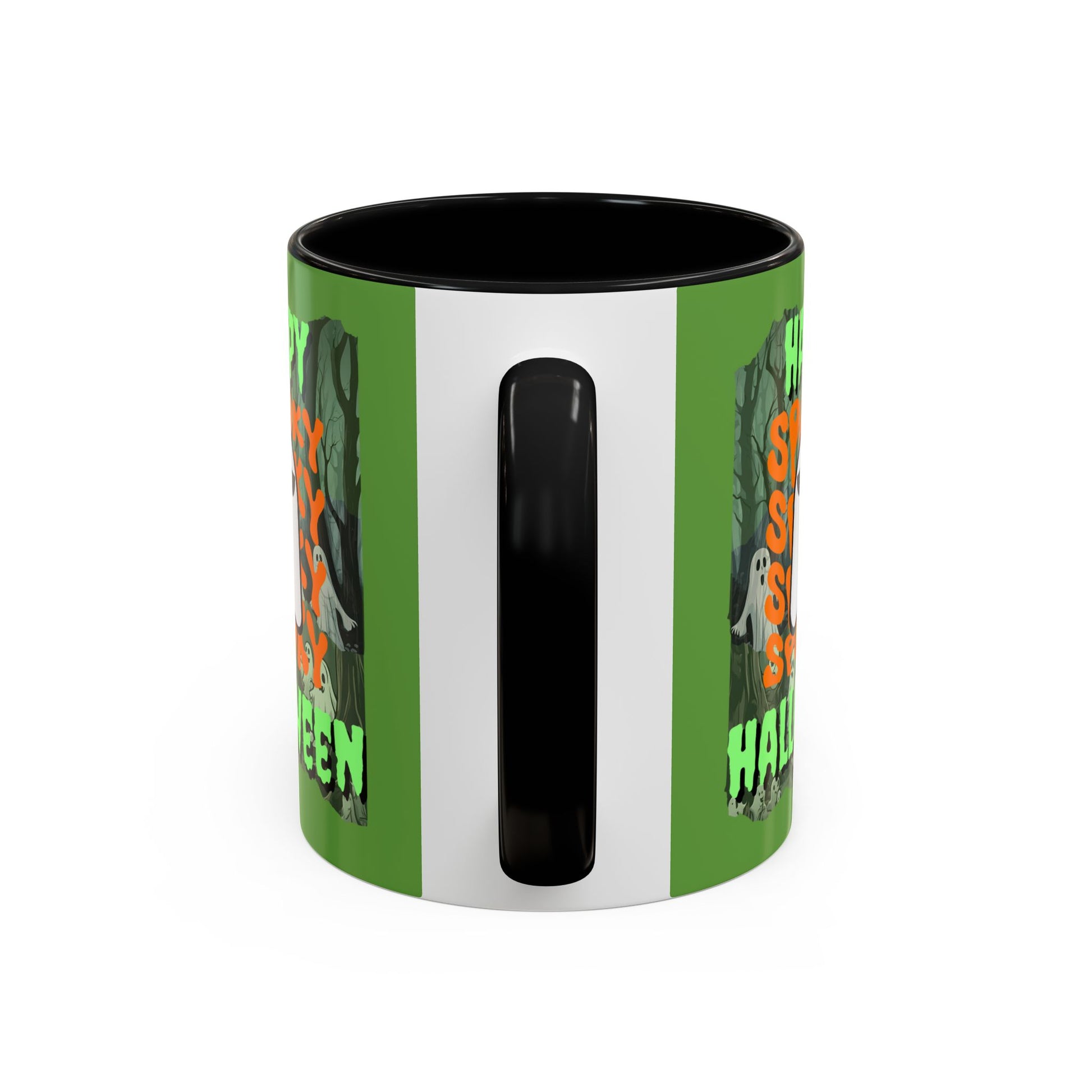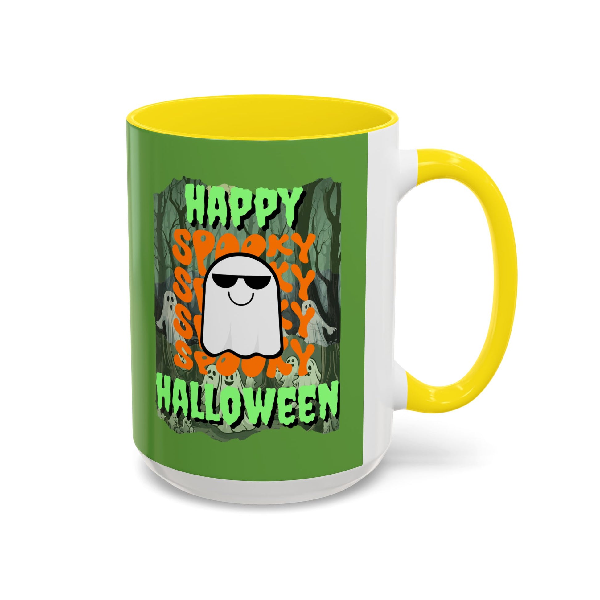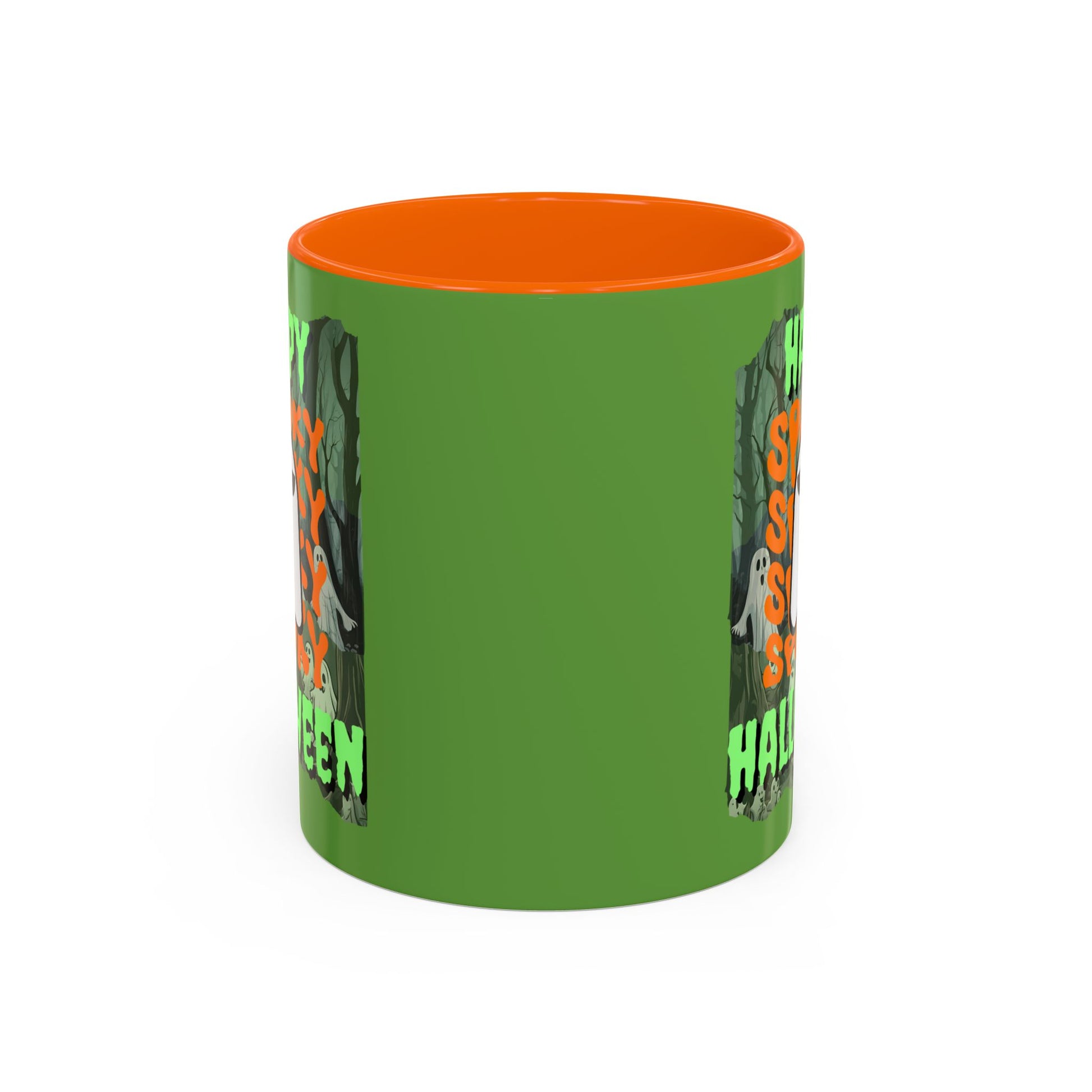 Spooky Happy Halloween Ghost Green font Green Accent Mug by CreepyCrafts.boo