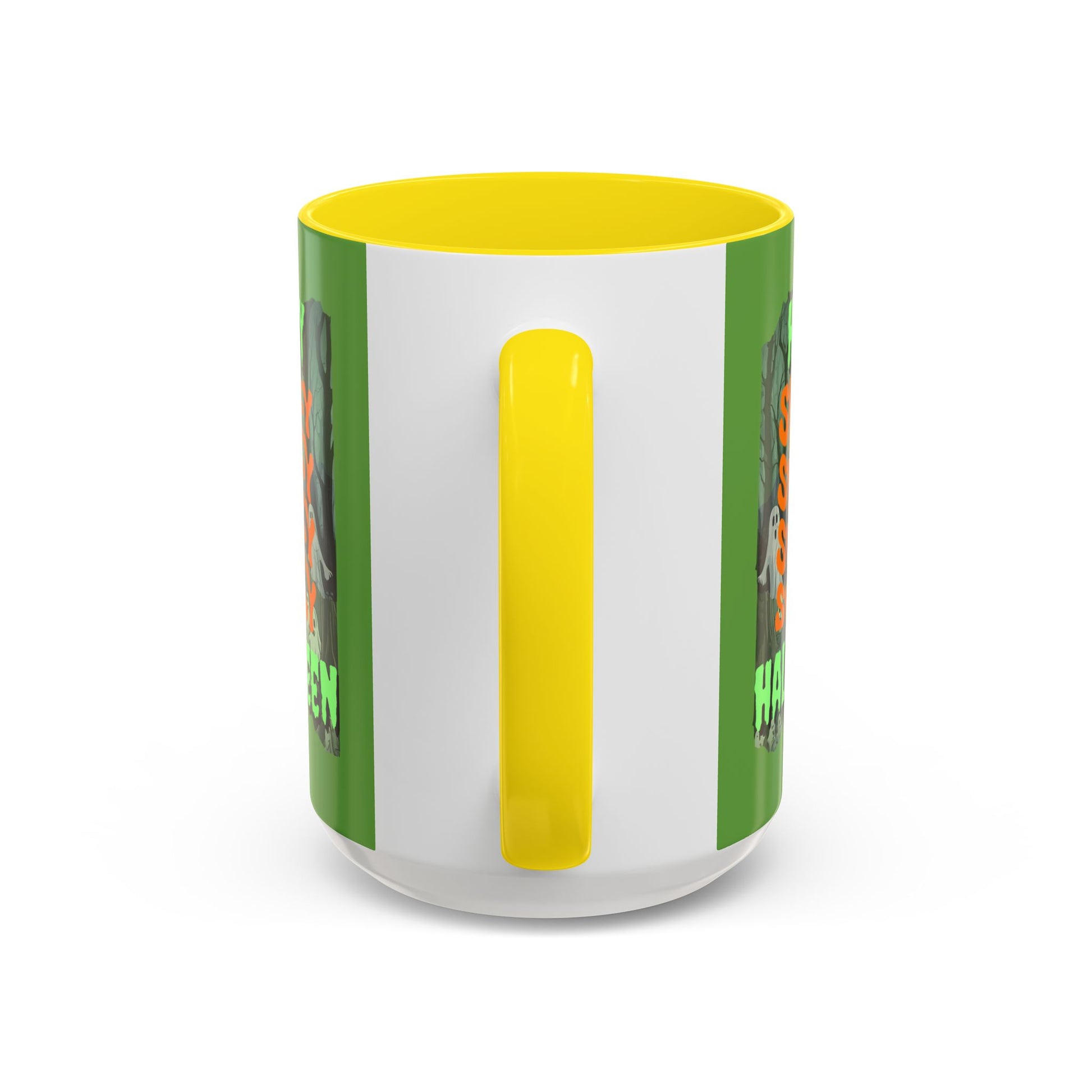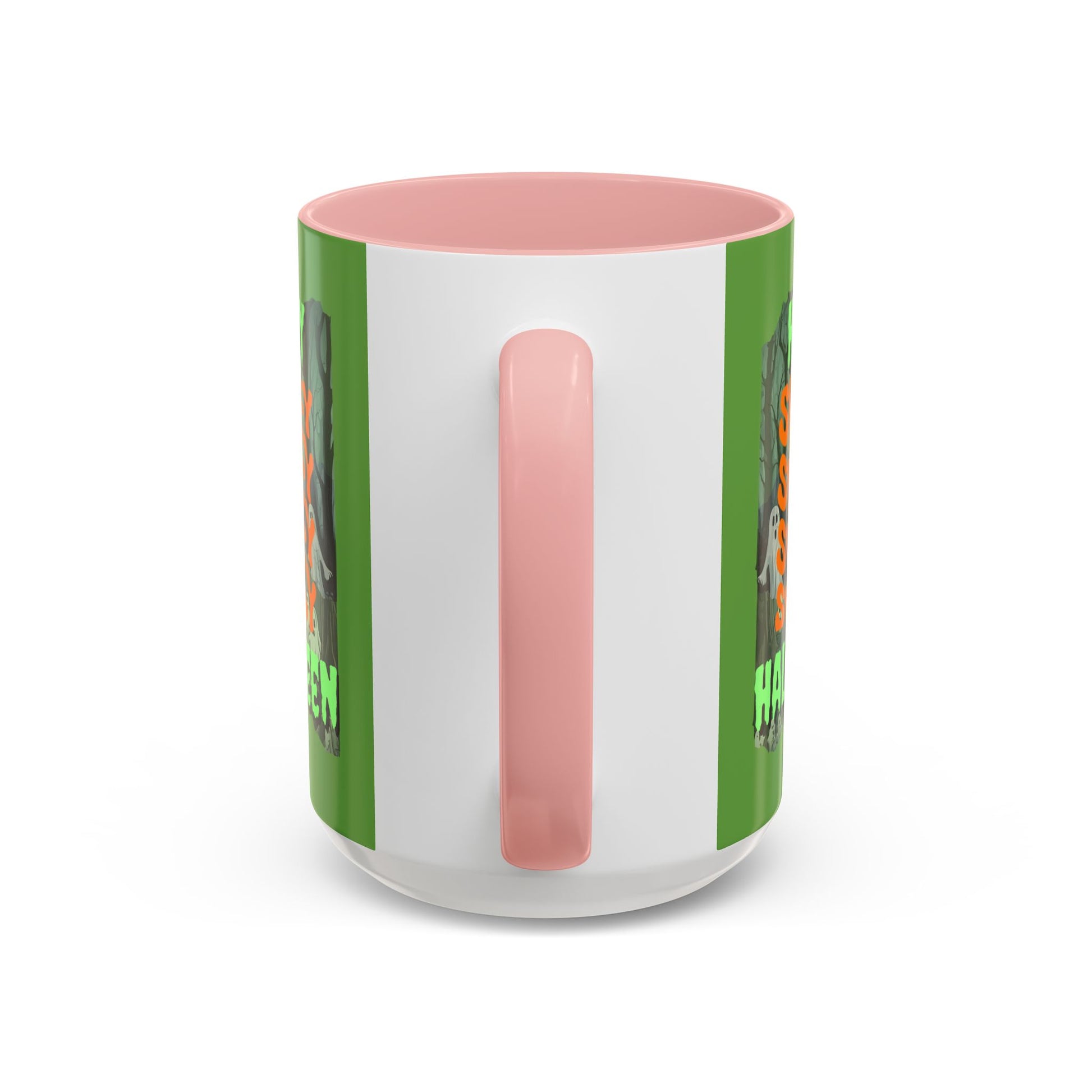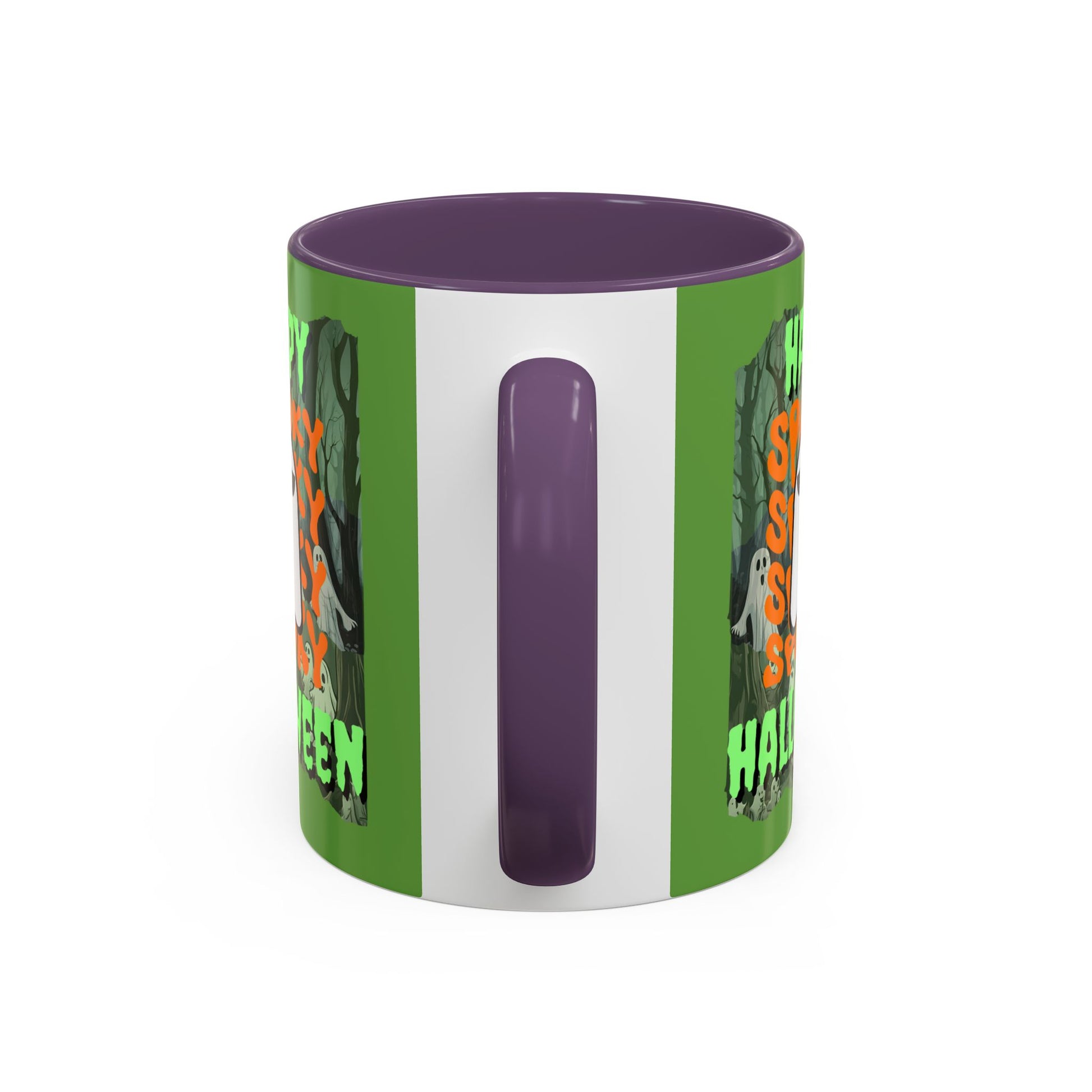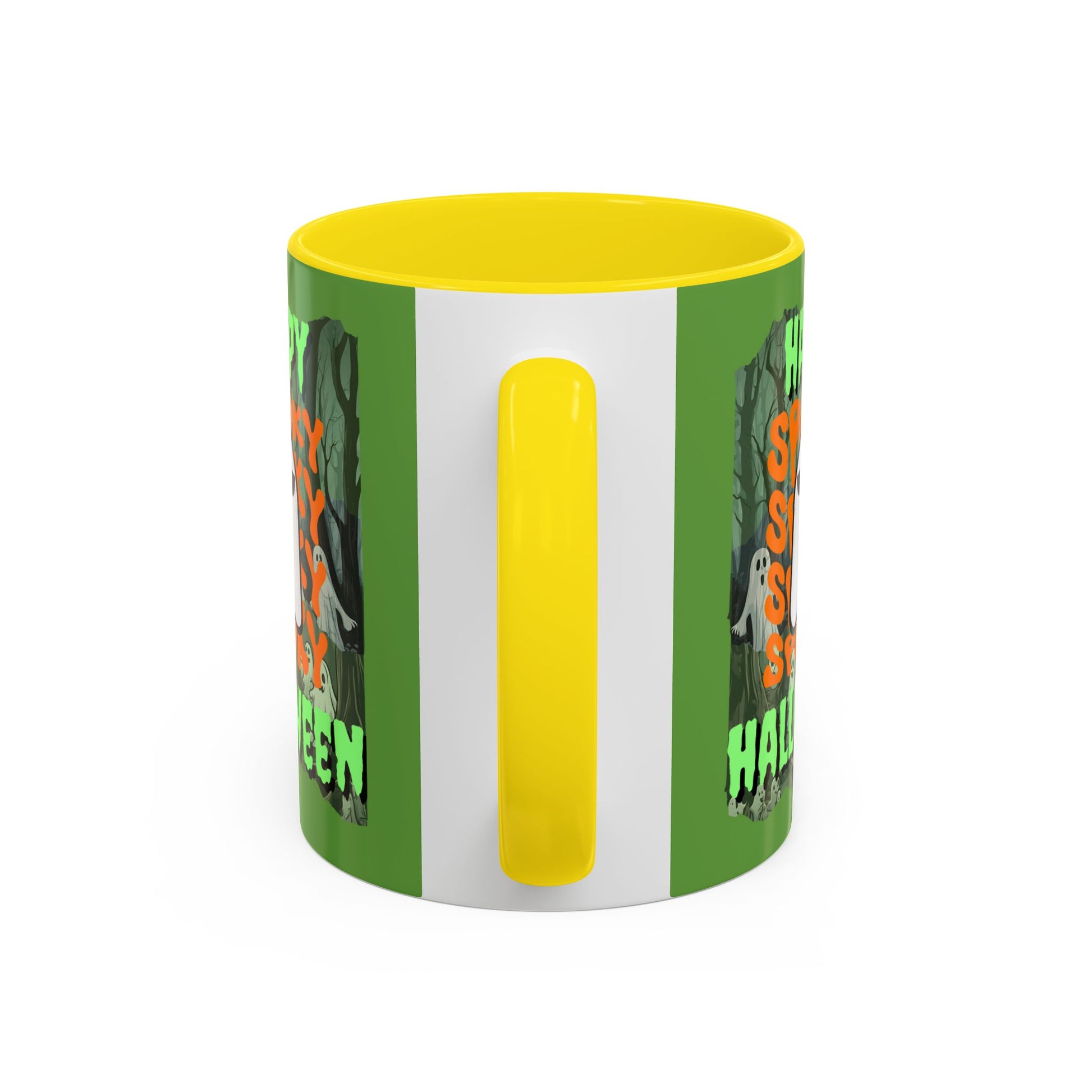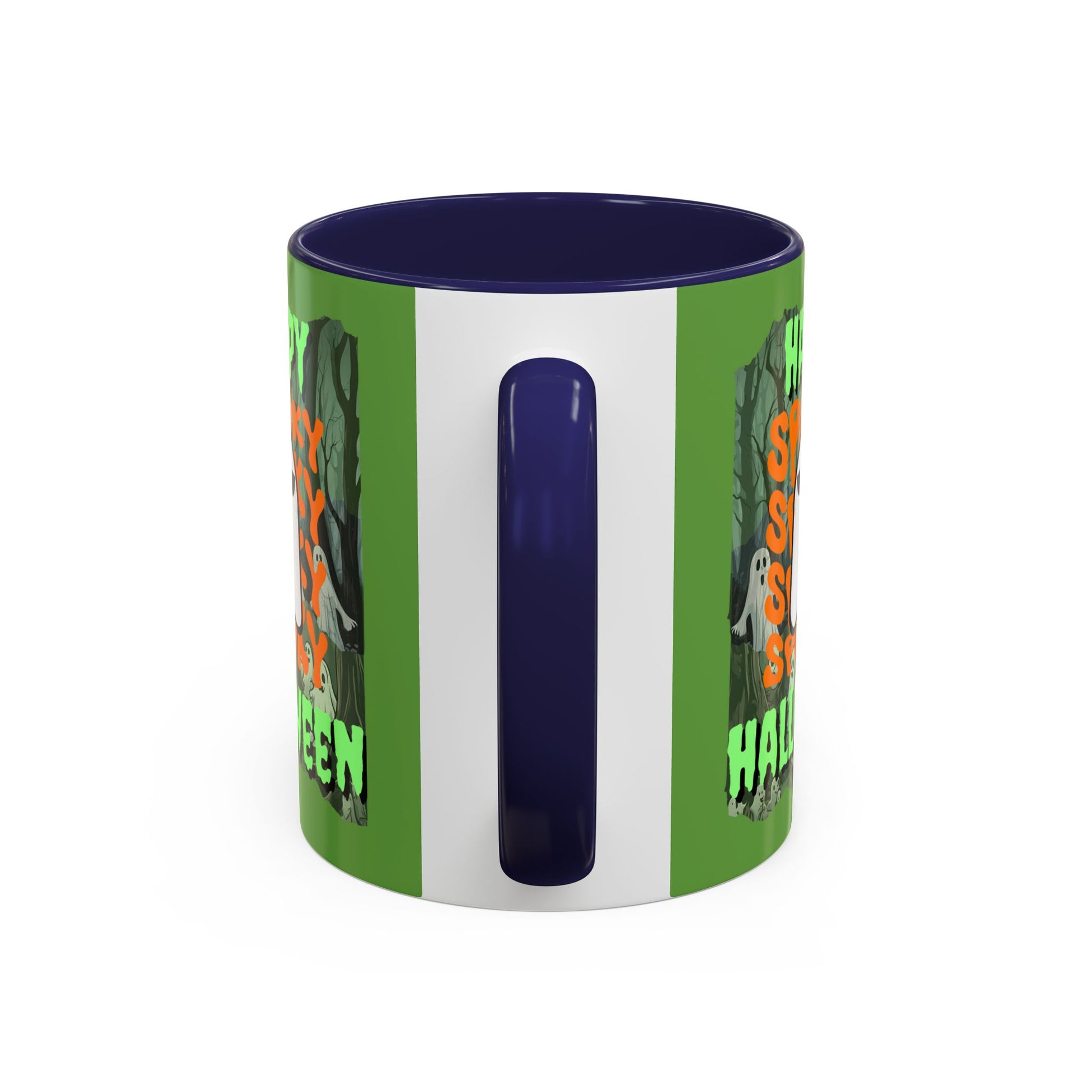 Spooky Happy Halloween Ghost Green font Green Accent Mug by CreepyCrafts.boo