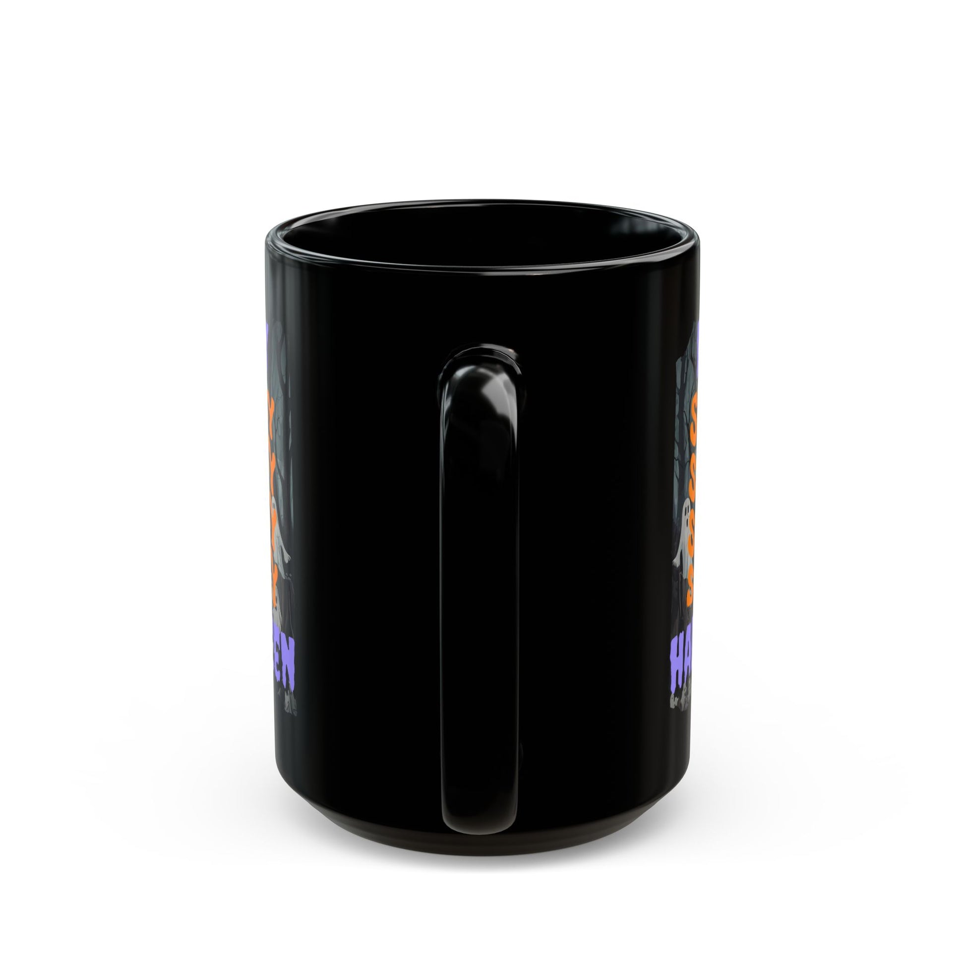 Discover the enchanting world of our Spooky Happy Halloween Ghost Purple font Black Mug by CreepyCrafts.boo