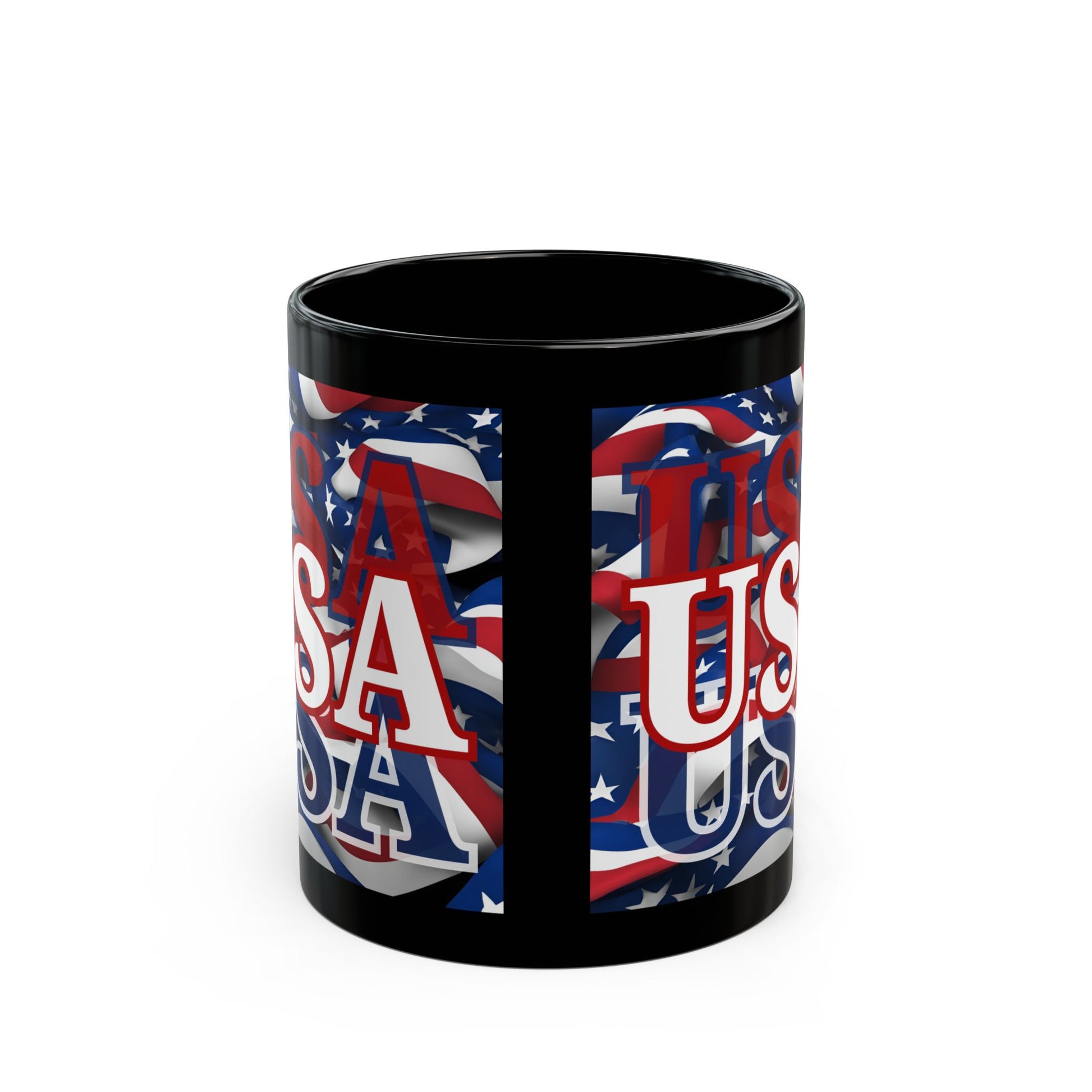 USA! USA! USA! Show your patriotic spirit for the red, white, and blue with the USA White font Center Patriot Black Mug by cypherpunkgear.com