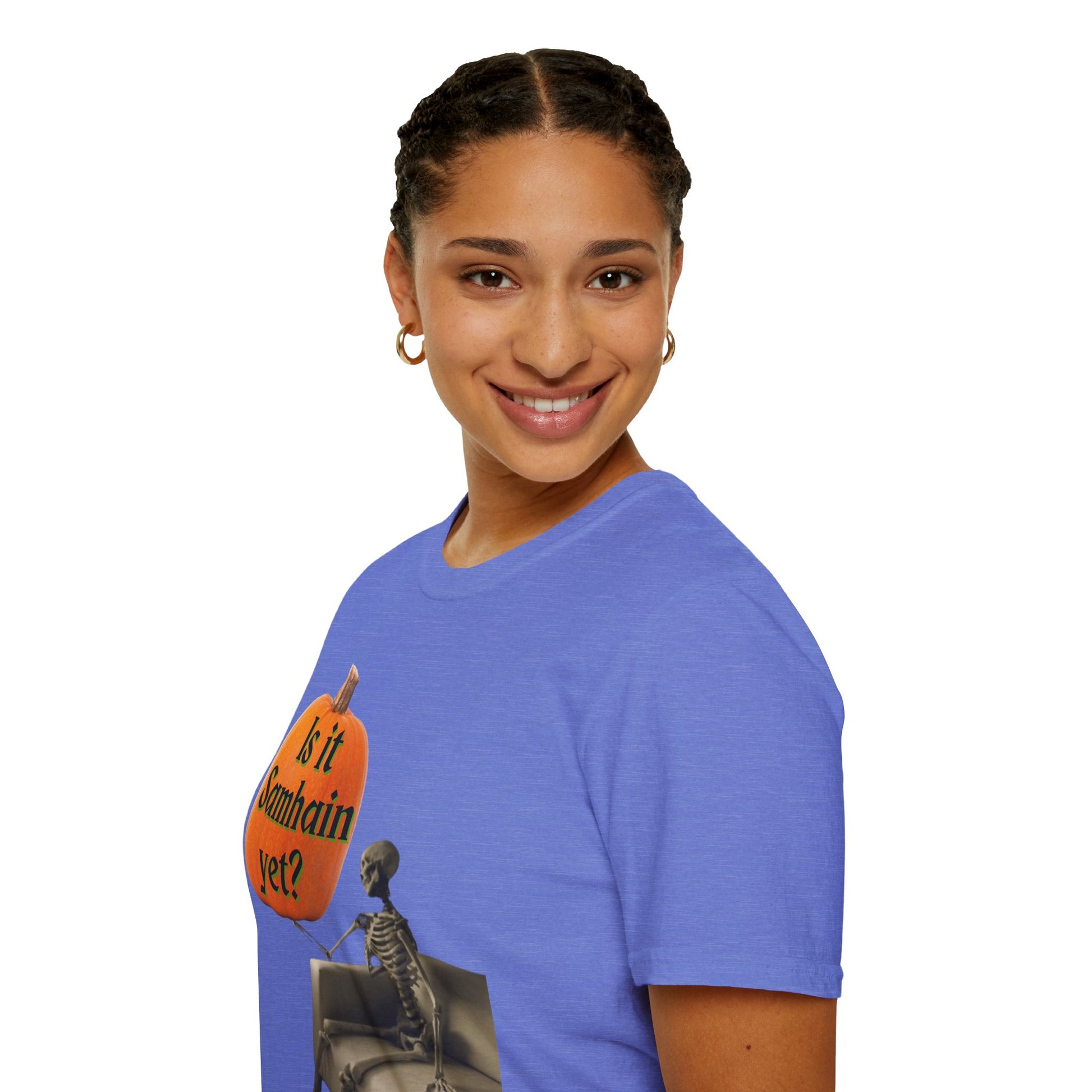 Been waiting eons for the ancient festival? The Is It Samhain Yet? Skeleton's Pumpkin Light colors Unisex T-Shirt from CreepyCrafts.boo is your mystical must-have! Picture a skeleton, once a Samhain devotee, eternally lounging on a couch, hoisting a pumpkin with the haunting question, “Is It Samhain Yet?” in eerie script. Perfect for pagans, witches, and autumn souls who honor the wheel of the year and crave the festival of the dead’s mystical vibes. This soft, comfy shirt adds spooky charm to bonfires or quiet fall nights. Grab yours now and wear your eternal Samhain wait proudly!