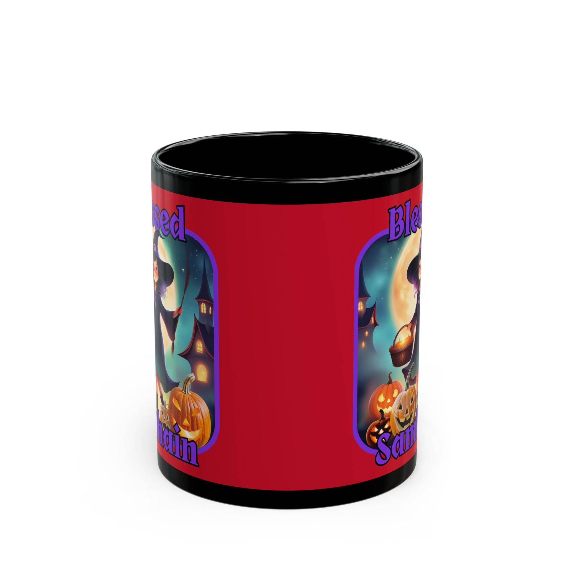 Also available with orange font: Blessed Samhain Little Witch Orange font Red Mug by CreepyCrafts.boo