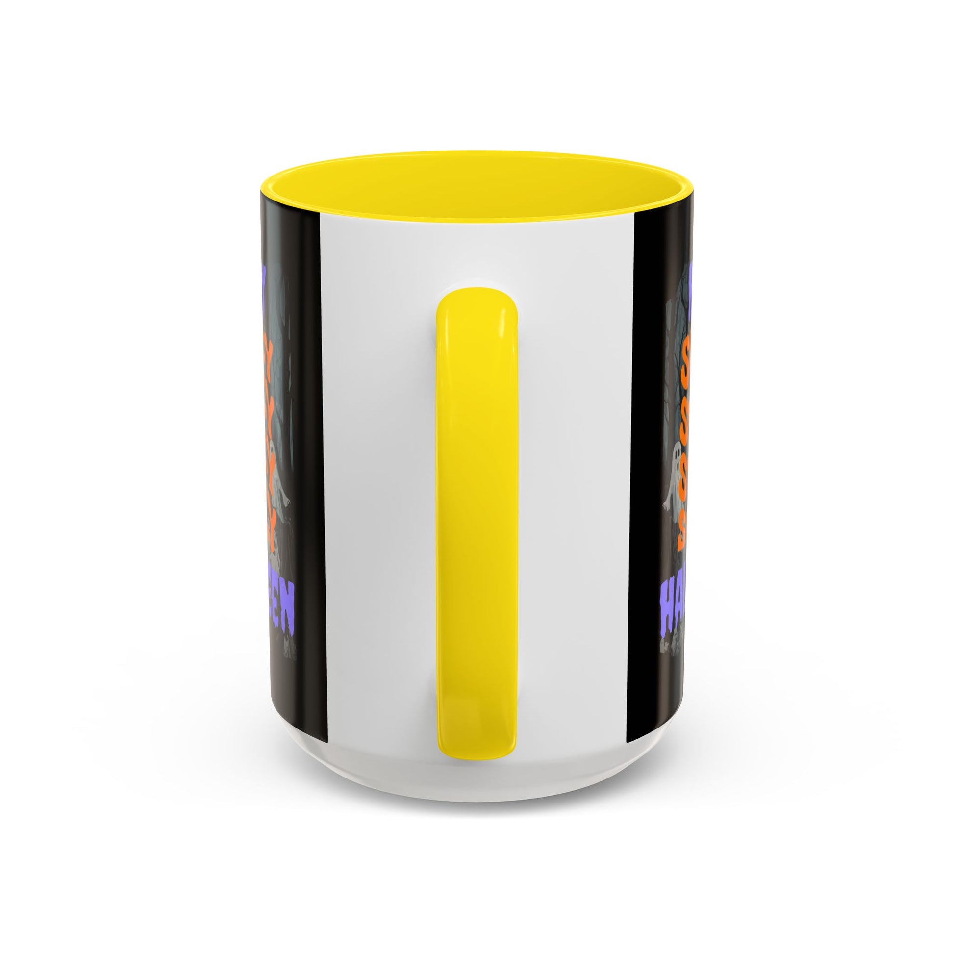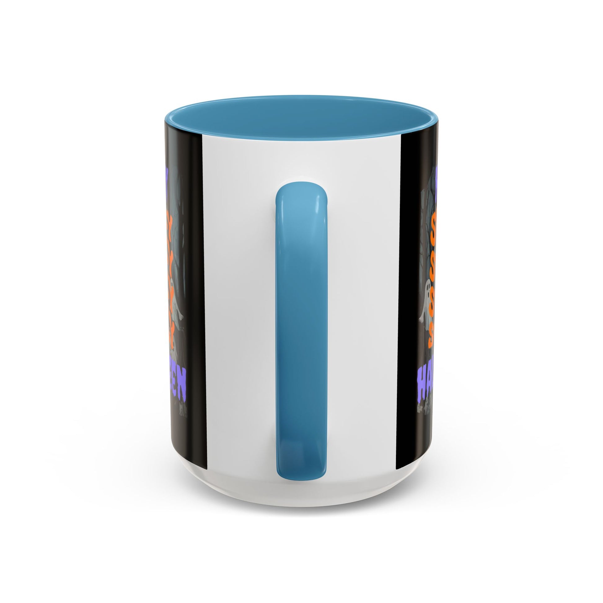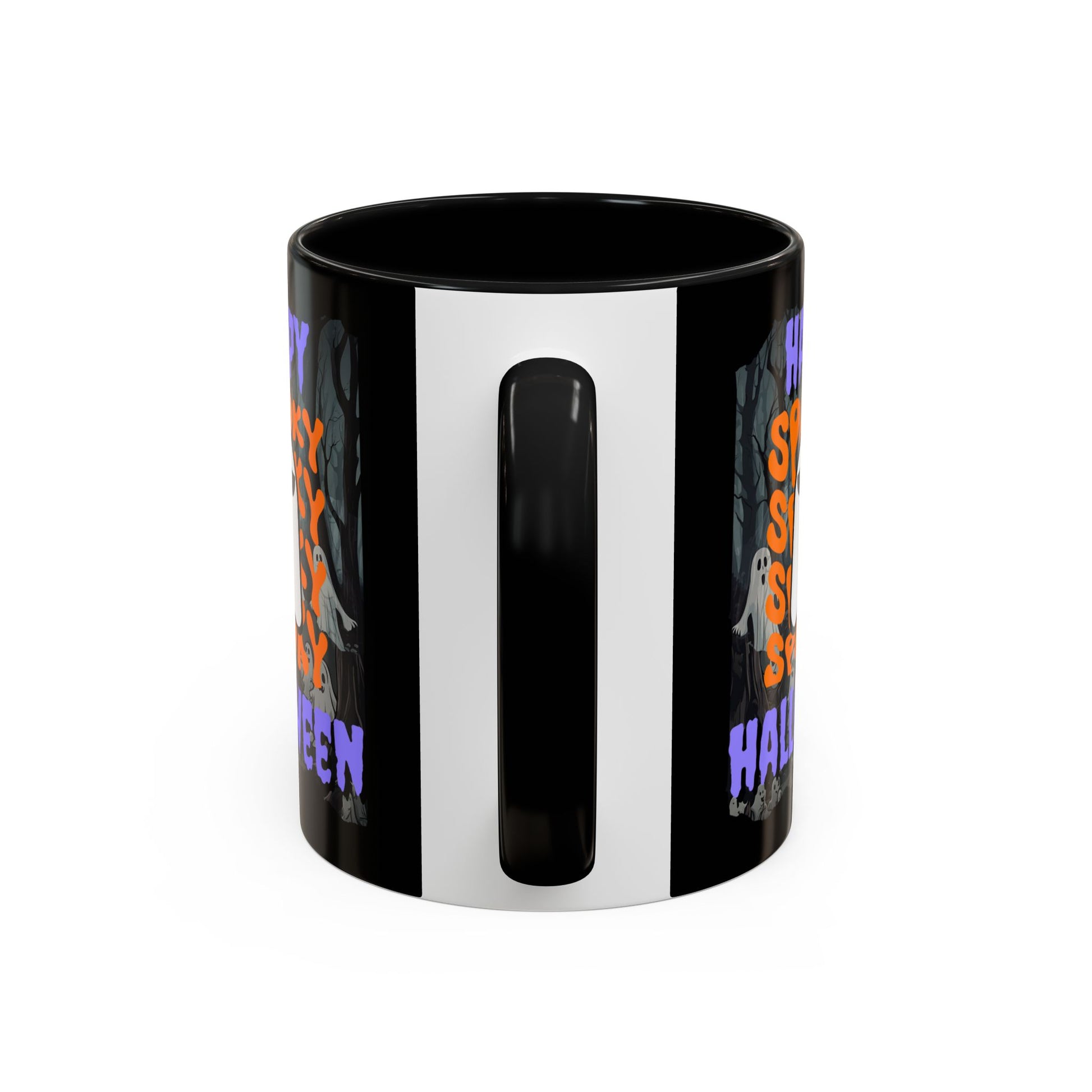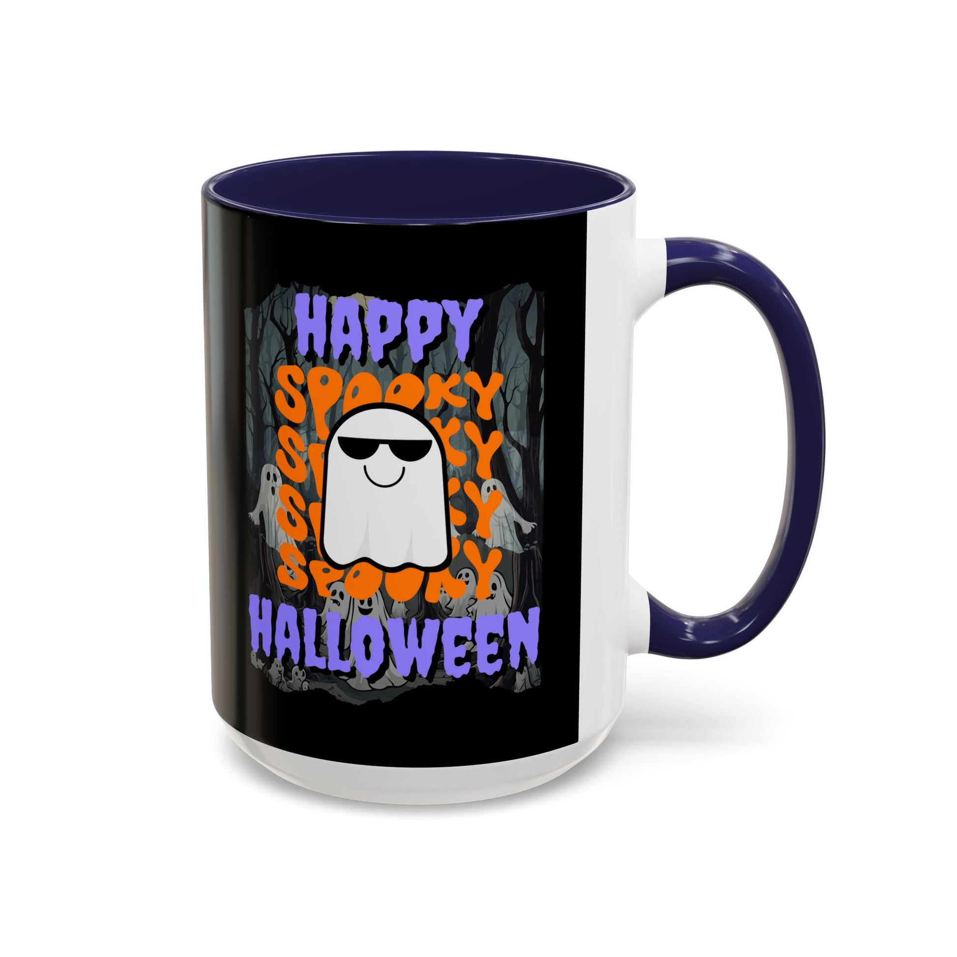 Or, if you prefer: Spooky Happy Halloween Ghost Mixed font Black Accent Mug by CreepyCrafts.boo
