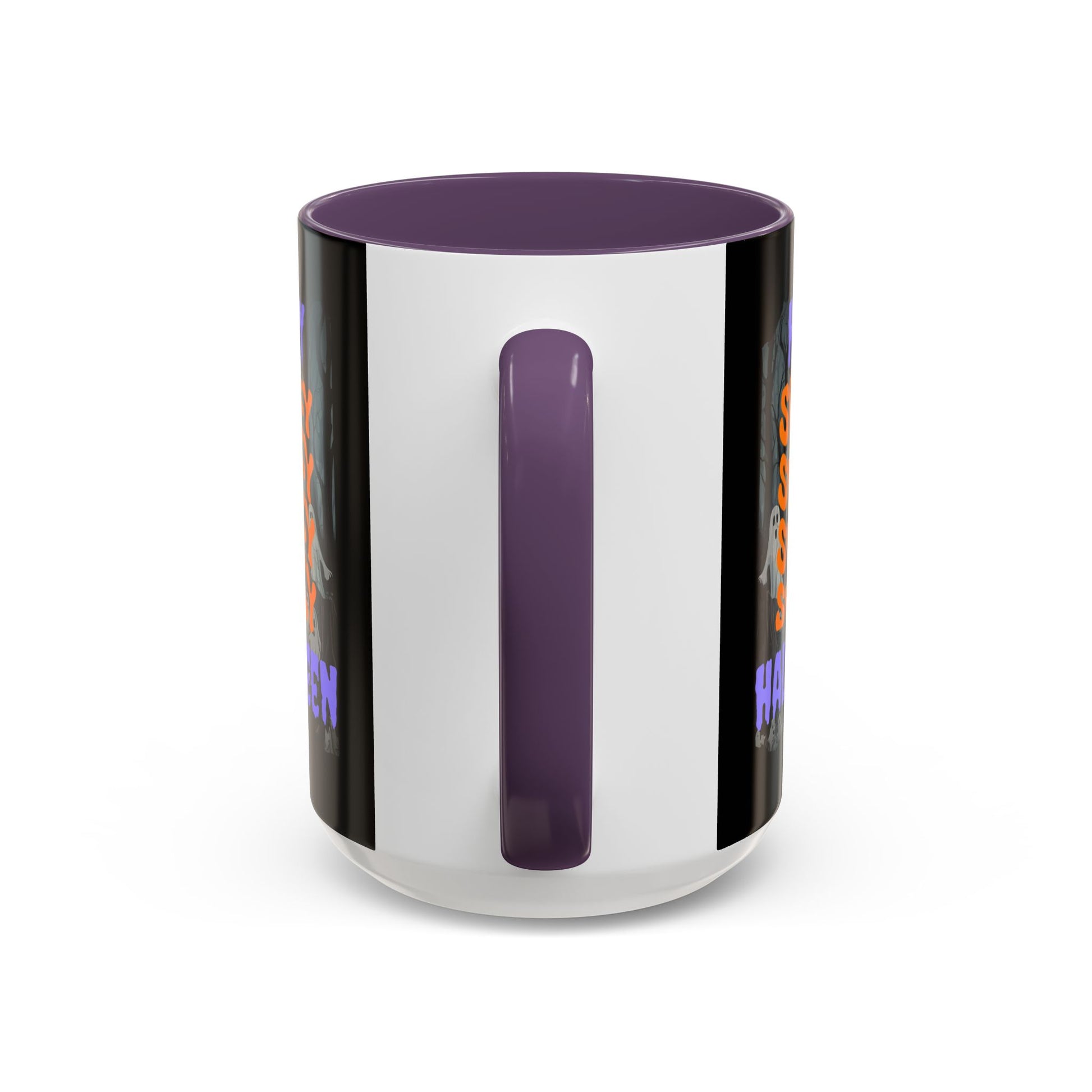 Spooky Happy Halloween Ghost Purple font Black Accent Mug by CreepyCrafts.boo