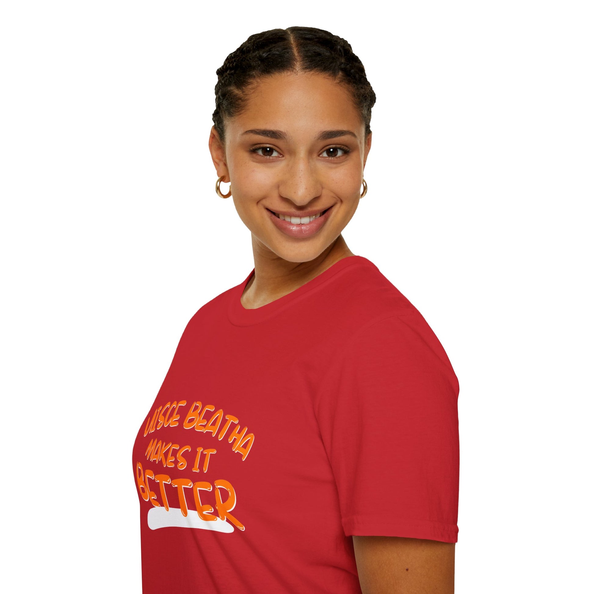 Uisce Beatha makes it better Orange font Light colors Unisex T-Shirt by cypherpunkgear.com!